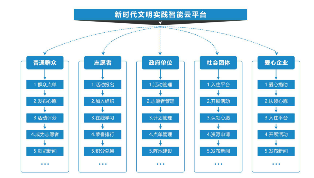 基于新時代文明實踐中心的建設(shè)需求,融合宣傳、學(xué)習(xí)、活動、志愿者服務(wù)于一體,為“群眾點單、中心(所、站)制單、層層派單”提供全流程技術(shù)支撐服務(wù),致力于打造集宣傳展示、互動互通、管理調(diào)度于一體的新型信息化互聯(lián)網(wǎng) + 新時代文明實踐中心。